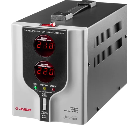Автоматический стабилизатор с цифровой индикацией АСН-1000-1-Ц ПРОФ. Зубр 59375-1 предназначен для обеспечения стабильным напряжением подключенных к нему устройств. Широко используется в бытовых и промышленных сферах для защиты техники от аварийных скачков электроэнергии.