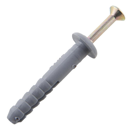 Применяется для крепления различных деталей к бетону, полнотелому кирпичу методом сквозного монтажа. Состоит из дюбеля с двухсегментной распорной частью с потайным бортиком, предотвращающим проваливание дюбеля в монтажное отверстие, и гвоздя с ударной резьбой. Используется преимущественно в быту и строительстве.