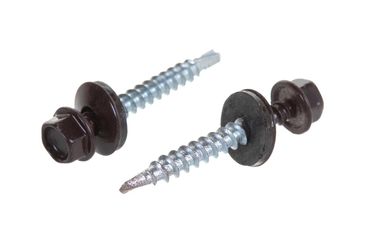 Саморез с шестигранной головкой, шайбой с резиновой уплотняющей прокладкой и сверлом на конце, позволяющим осуществлять монтаж без предварительного засверливания.