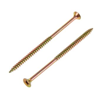 Шуруп универсальный жёлтый цинк с потайной головкой используется при скреплении деревянных элементов, соединении стальных элементов (с предрарительным сверлением отверстий) к основаниям из дерева. Могут использоваться совместно с дюбелями для монтажа конструкций в основания из полнотелых и пустотелых кирпича, камня, бетона. Шуруп желтопассированный универсальный производится из инструментальной углеродистой стали. После производства оцинковывается и пассируется. Имеет высокие антикоррозийные свойства и может быть применен в уличной среде.