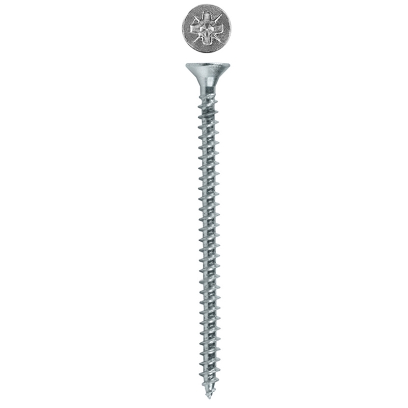 Универсальный саморез имеет двойной крестообразный шлиц PZ и потайную головку.
