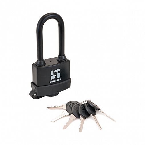 Замок навесной с длинной дужкой. Замок навесной, всепогодный, с увеличенным количеством ключей. Материал корпуса выполнен из высокопрочного чугуна. Корпус замка и цилиндровый механизм имеют защитный пластиковый кожух.