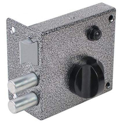 Замок с двумя цилиндрическими ригелями, что удобно для установки в металлические двери.
